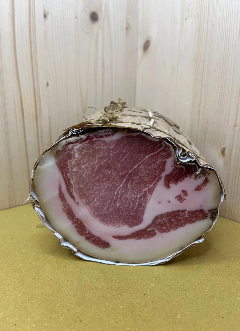 Eccezionale! prodotto con suino del monte peglia allevato allo stato semi-brado. Contrapposizione perfetta di sapori dove la parte del lombo, più sapida, viene smorzata dalla dolcezza del lardo di schiena. Stagionato 10 mesi.